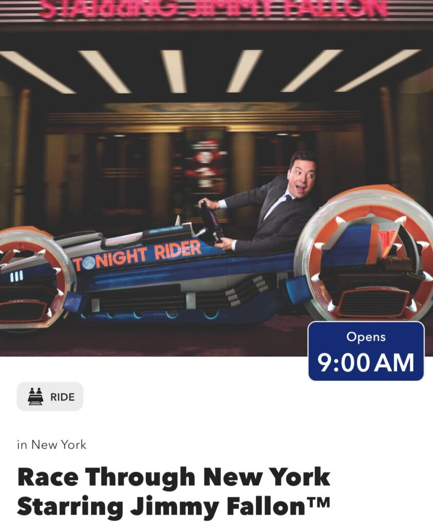 이제 다시 앞으로 가보자. 여러분 왼쪽에 지미 팰런 쇼 라이드가 보일 것이다. 지미 팰런 쇼는 미국에서 굉장히 유명한 토크쇼고 티비를 잘 보지 않는 나도 이름은 한 번 들어본 쇼다. 하지만 '이걸 토대로 라이드를 만들면 도대체 무슨 재미가 있나' 하는 의심은 지워지질 않았고 결국 제일 나중에 더 이상 탈게 없을 때 '그래도 이왕 온거 다 타보자' 하는 마음에 탔다.