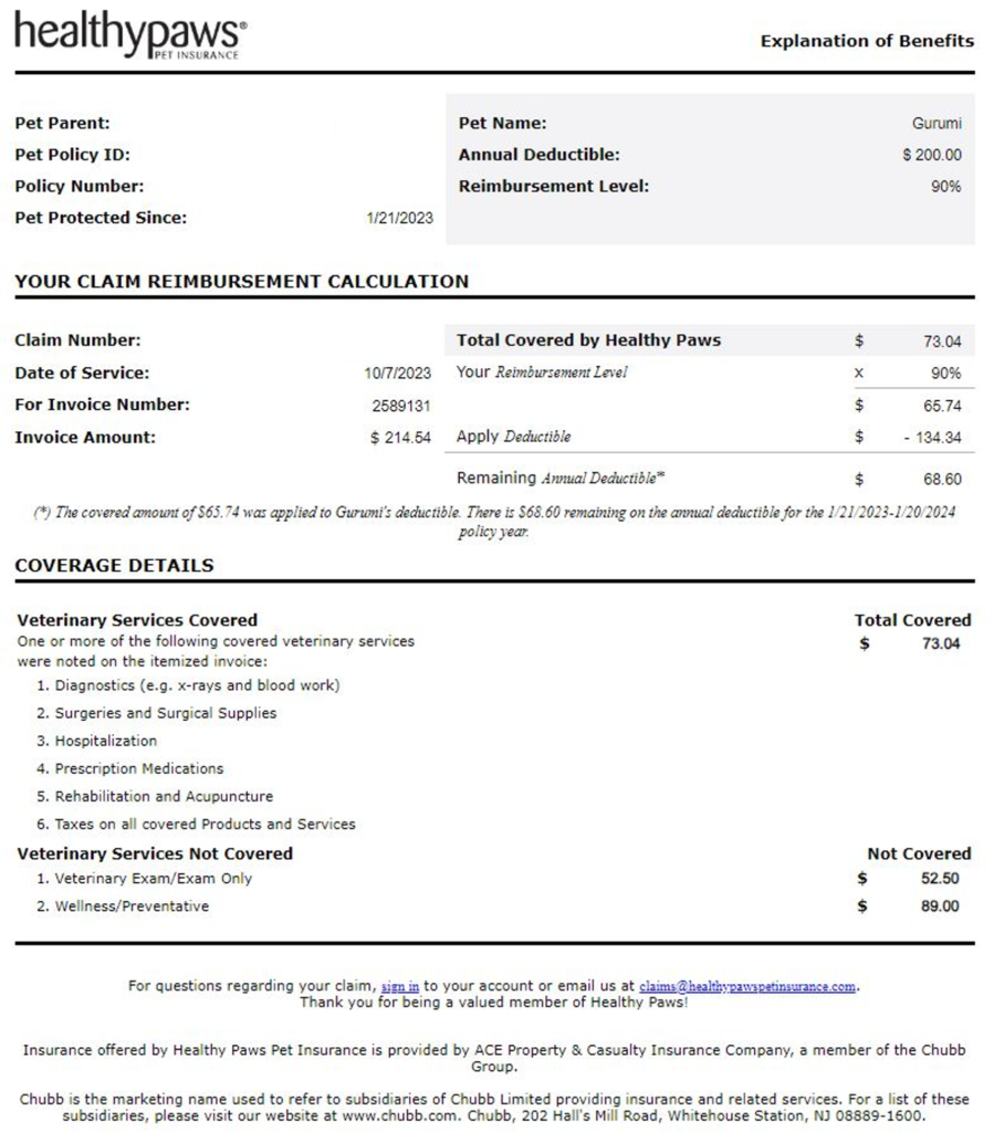 당신의 고양이가 아파서 수술을 했고 수술비가 $3,000이 나왔다고 하자. 이때 당신의 보험 플랜이 Deductible $200, Coverage 90%라고 가정해보자.