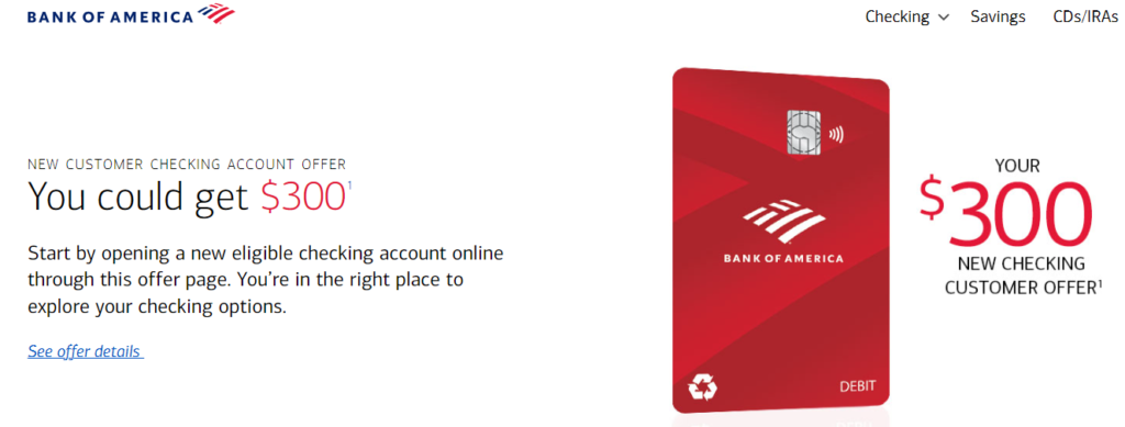 BOA bank bonus 라고 검색을 해보니 바로 아래 사이트를 찾아 볼 수 있다. 세상에 $300이라니, 내가 만들었을 때는 $200 이었는데. 이렇게 그때그때 마다 조건과 금액이 조금씩 다를 수 있으니 그 점도 참고해주면 좋겠다.