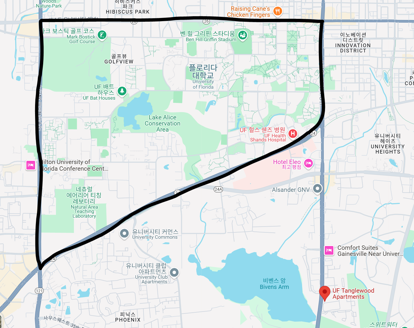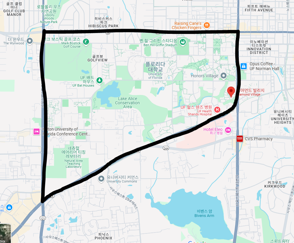 또 다른 단점 중 하나는 위치에 관한 것이다. 위에 올린 지도에 검은 사각형 중 왼쪽 선에 다이아몬드 아파트가 굉장히 근접하게 위치해있다. 저 검은색 도로는 13번가라고 부르는데 저 길이 이 게인즈빌의 약간 복부대동맥 쯤 정도로 생각할 수 있다. 그만큼 교통량도 많고 사람도 많다. 이 말을 다르게 해석하면 사고치는 대학생도 많고, 사고나는 자동차도 많고, 경찰차 출동하는 일도 많다는 뜻이다. 그래서 경찰차 사이렌 소리가 집에서 심심치않게 들린다. 그 부분은 조금 아쉬운 점이라고 할 수 있다. 특히 학생들이 많이 노는 게임데이나 할로윈 시즌엔 아주 사람이 많고 사이렌 소리나 사교회 (fraternity, sorority 등) 에서 나오는 음악소리도 방에서 들리는 경우가 종종 있다.