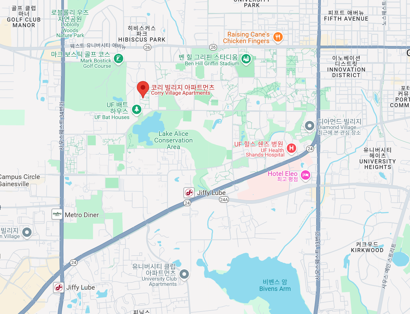 코리 아파트는 학교의 왼쪽에 있다. 장점으로는 위치가 우선 복잡복잡한 학교의 메인 건물들과 좀 떨어져있다. 그래서 그런지 기숙사같은 느낌보다는 진짜 집의 마을같은 느낌이 덜하다. 그리고 탱글우드와 다이아몬드는 13번가라는 길 바로옆에 있었는데 코리아파트는 캠퍼스 깊숙한 곳에있어서 그런 길거리 소음으로부터 상대적으로 자유로운 편이다. 그리고 바로 아파트 단지 앞에 Lake Alice Conservation Area 가 있는데 이 호수가 또 나름 이뻐서 동네 산책할 때 좋을 것 같다.